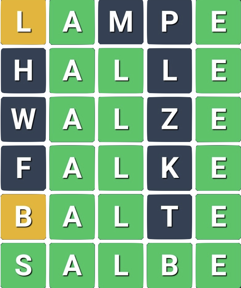 Finde das tägliche Wort in 6 Versuchen. Jeder Versuch muss ein Wort mit 5 Buchstaben sein. Ä, Ö & Ü werden durch AE, OE & UE ersetzt. Zulässig sind Grundformen und Einzahl. Drücke ENTER, um das Wort zu prüfen. Nach jedem Versuch ändert sich die Farbe der Kacheln, um anzuzeigen, wie nahe Dein Wort an der Lösung war. Ist ein Buchstabe grün, dann ist er ebenfalls im gesuchten Wort, und dort sogar an derselben Stelle. Ist ein Buchstabe gelb, dann ist er ebenfalls im gesuchten Wort, jedoch an anderer Stelle. Ist ein Buchstabe grau, bzw. verändert seine Farbe nicht, dann ist er im Lösungswort nicht enthalten.