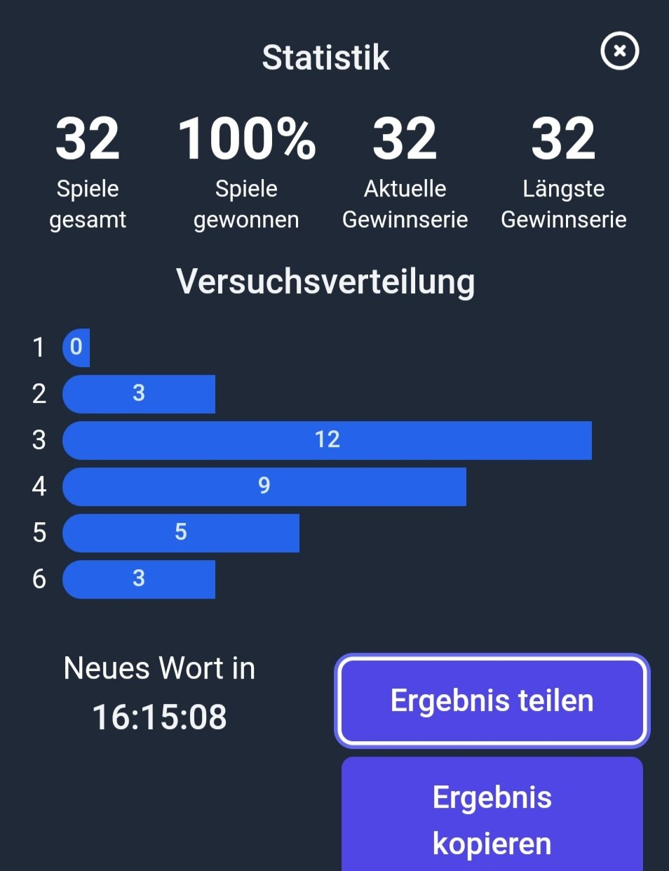 Deine persönliche Statistik zeigt dir jeden Tag, wie Du heute im Vergleich zu den vorherigen Tagen abgeschnitten hast. Und nicht nur das – Du siehst ebenfalls, wie viele Spiele Du bereits gespielt hast, wie viel Prozent Du davon gewonnen hast, wie lang Deine aktuelle Gewinnserie andauert, und wie lang Deine insgesamt längste Gewinnserie andauerte. Mit den Buttons zum Teilen oder Kopieren kannst Du Kinderleicht Dein heutiges Ergebnis in Deine Chatgruppe, auf Twitter, oder allen sonstigen Kanälen posten. So kannst Du anderen Deinen Lösungsweg zeigen, oder Ihr vergleicht gegenseitig Euer Können und diskutiert die jeweiligen Taktiken!